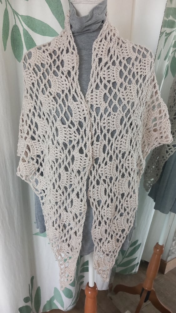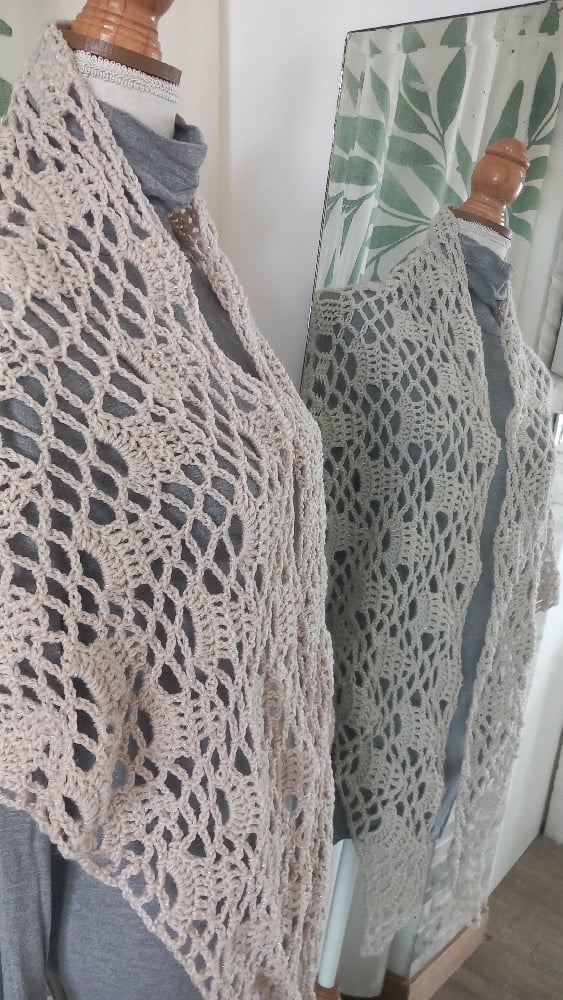 Je vous propose un châle que j’ai réalisé avec beaucoup de patience et d’amour, maille après maille.