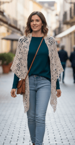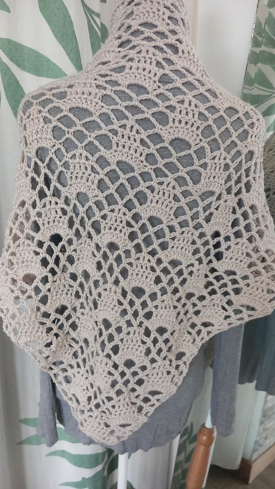 Son délicat motif ananas, travaillé au crochet, lui donne une allure à la fois élégante et intemporelle. Le fil légèrement métallique apporte une touche subtile de brillance, comme un léger éclat sous la lumière, parfait pour illuminer une tenue tout en douceur.