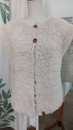 Laissez-vous envelopper par Le Gilet Mouton, un gilet irrésistible sans manches au crochet couleur écru, revisité pour sublimer la femme avec douceur et élégance.