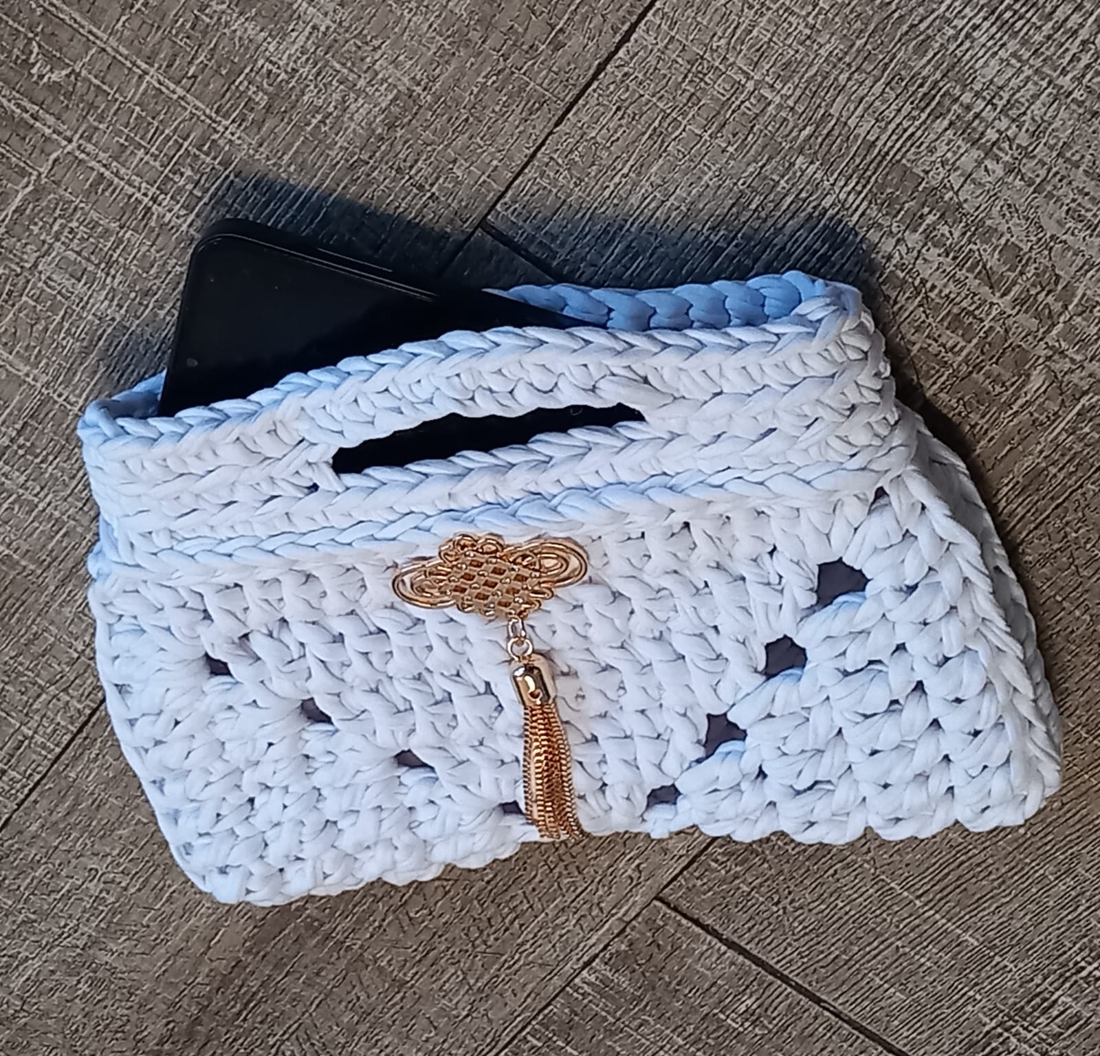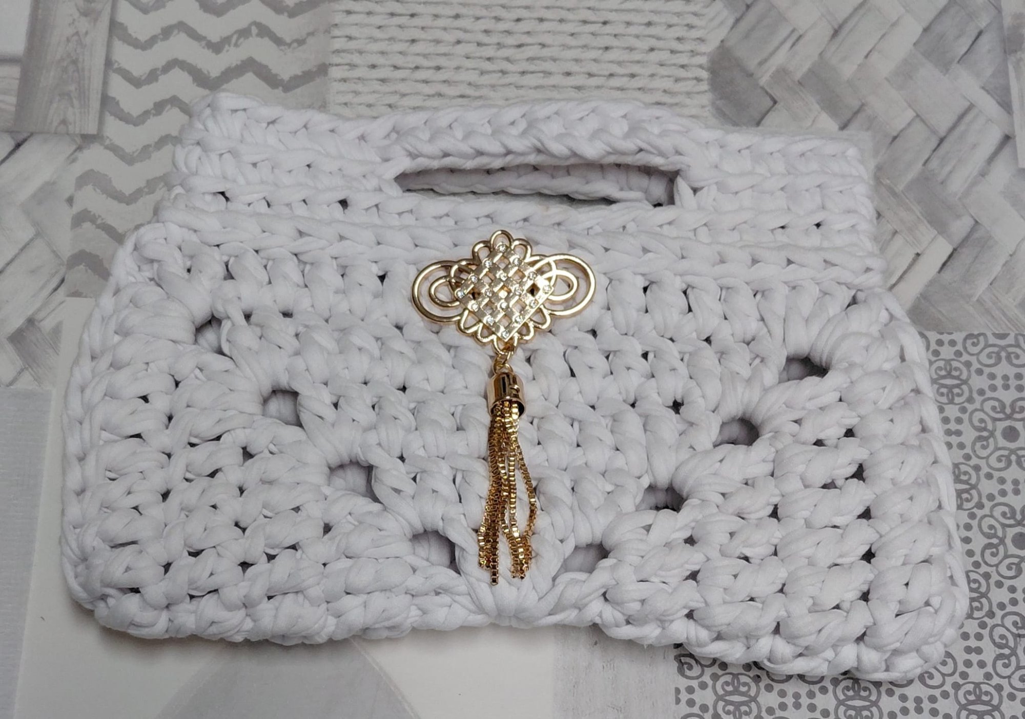 Trés jolie pochette en coton recyclé blanc, ornée d'un magnifique bijoux délicat et raffiné qui apporte une touche féminine et trés élégante.